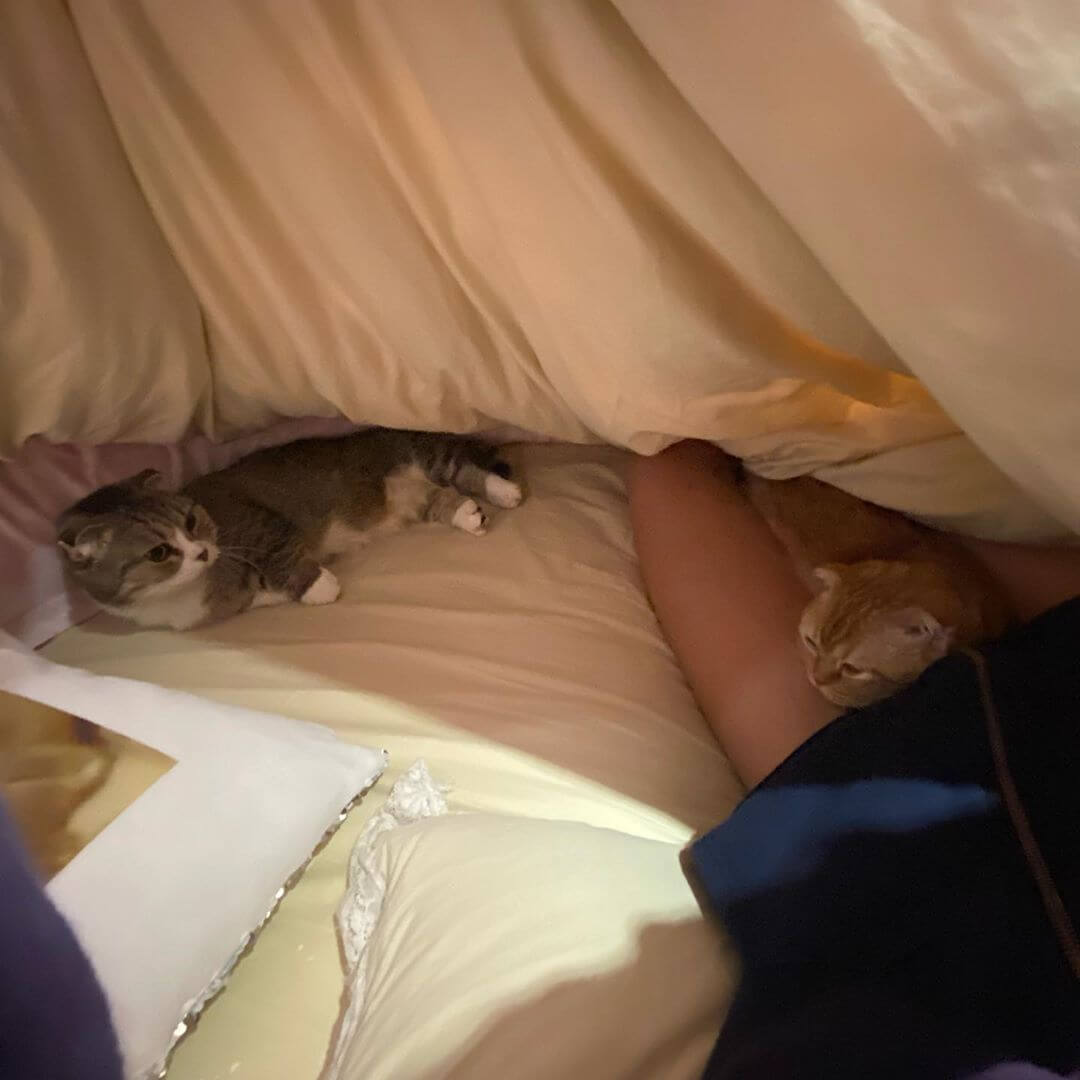 不過,網友們看到照片之後,發現了一件非常有趣的事,當師傅在更換壁紙時,小禎家中的三隻喵星人竟然出現超兩極的反應,其中一隻相當專心的全程跟在師傅身邊,好像是在「監工」一樣,而另外兩隻則是被陌生人給嚇到趕緊躲進被窩裡,毛小孩的逗趣反應,意外成為網友們關注的焦點。