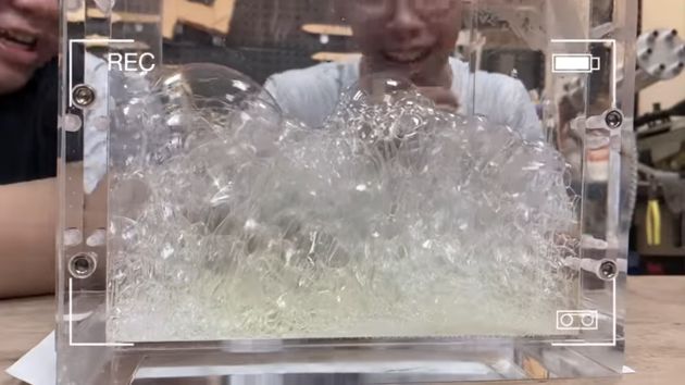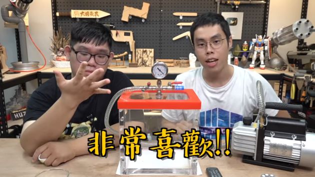 YouTube頻道「胡子Huzi」以拍攝各種稀奇古怪的實驗聞名,截至目前為止訂閱人數達到74.4萬人次。近日胡子推出一個將物品「抽真空」的實驗,抽真空的實驗就是利用幫浦將容器內的空氣抽除,一直到氣壓接近真空為止。除了將「雞蛋」、「珍珠奶茶」抽真空之外,胡子和阿晉還將「史萊姆」放進容器裡面,只見空氣抽到一半,史萊姆逐漸變成泡泡的形狀,最後竟然膨脹到填滿整個容器,這個爆走的情況也讓在一旁觀看的阿晉直呼:「好噁喔!」