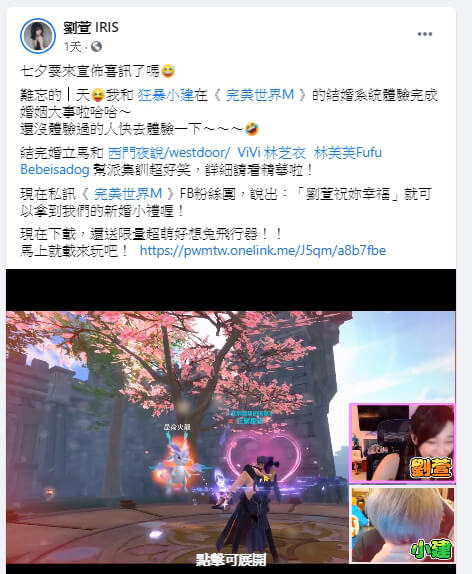 近日她與實況主「狂暴小建」經常一起開台且互動親密,沒想到在七夕當天,兩人竟公開在社群平台大肆放閃,利用知名手遊《 完美世界M 》裡的結婚系統來共結連理,雖然實況中充滿了粉紅泡泡,但網友都認為是七夕做效果而已,但是劉萱昨日在與實況主「豆豆在這裡」玩無名小鎮時,竟脫口承認了要他們稱呼實況主「狂暴小建」為姐夫,讓豆豆興奮地直呼:「哎呦終於承認啦!結婚了嘛~」。