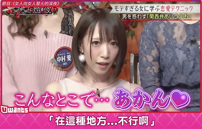 清水藍里表示這些句子都很適合在跟男朋友相處的時候使用,乍聽之下只覺得像是可愛的撒嬌,但配上她不斷擠胸、挑逗的動作讓這些句子瞬間變得「色氣」滿滿,在場的男來賓也快要凍未條,主持人更直呼:「這應該是我最喜歡的節目環節!」