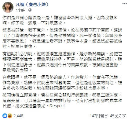 此外,廣告小妹也特別指出,「有個點我必須說,他後續直播這動作,是炒新聞無誤。別把它解讀得那麼偉大,還傳承精神咧!可是,他的職業就是網紅~脫下網紅這個身份,他無法達到今日的商業成就,被開槍還直播,是敬業的表現!」只是,在廣告小妹的眼裡,他認為館長不是及格的商人,「作為資方,他實在不怎樣,作為賣家,功課不做就出來叫囂同業,但他是個敬業的網紅!被告很多次依然自我,在藍綠兩邊撈了不少粉絲也是本事!」