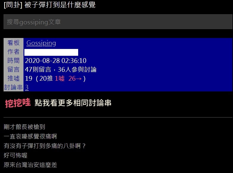 館長在被連開3槍之後,痛苦到直接倒地不起,完全無法站起來,但還是不忘開直播交代後事,以免到時候身體真的出什麼意外!不少網友看到館長中槍之後的直播影片,都紛紛開始在網路上掀起一波波的討論,在PTT也有網友以「被子彈打到是什麼感覺」為題發文來詢問鄉民們,沒想到竟引起熱烈的迴響,討論度超高!