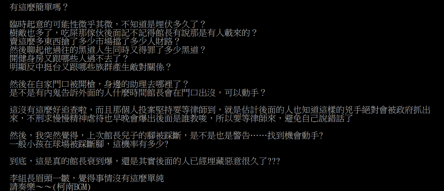 雖然館長現在已經脫離險境,不過整起事情仍未落幕,不少網友紛紛在網路上「揣測真相」,像是有網友在PTT上發文表示,「館長賣這麼多東西,搶了多少市場、擋了多少人財路?聊起他過往的黑道人生時,又得罪多少黑道?開健身房又跟哪些人過不去?反中挺台又跟哪些族群產生了敵對關係?」,該名網友還提出質疑說,「在自家門口被開槍,身邊的助理去哪裡?是不是有內鬼告訴外面的人館長什麼時候會在門口出現,讓對方可以趁機動手?」,網友甚至還認為,館長兒子之前腳被踩斷一事,有可能就是在對館長提出警告,他還提出了多方論點,引起其他網友們更加熱烈的討論了起來!