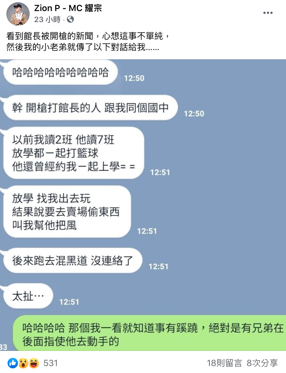 Youtuber「館長」陳之漢在28日凌晨被一名男子連開3槍,右手、右腳皆中槍,持槍兇手就是之前曾被館長控訴「性騷擾」的23歲男子,而他在開槍後也已自行投案。事後許多網友及專家都認為事情並不單純,更懷疑兇手背後可能有更大的勢力支持,而黃國昌也列出5大疑點表示「應非只是警告!」