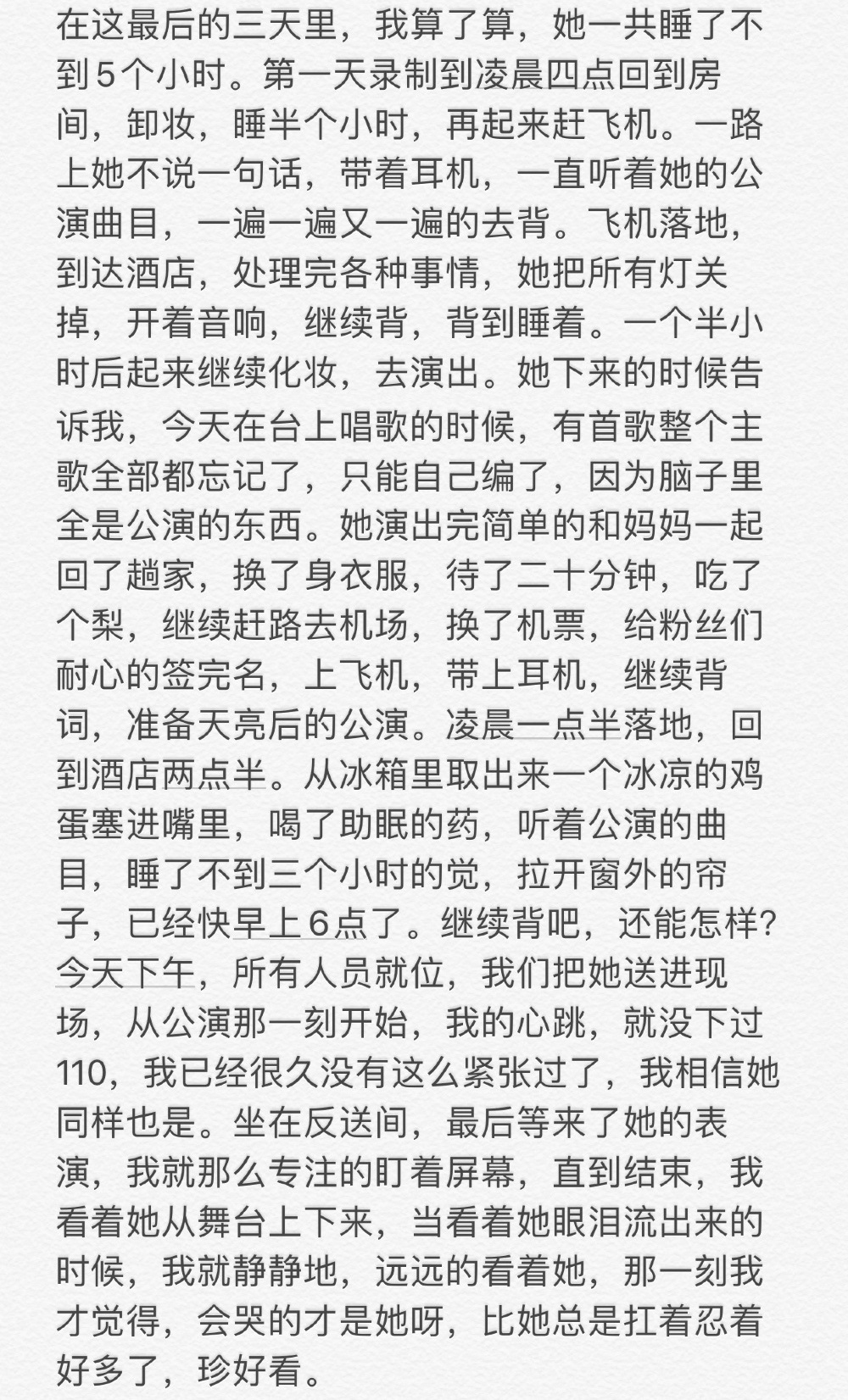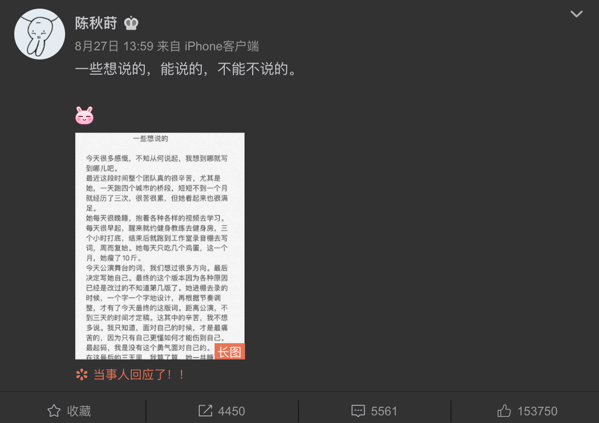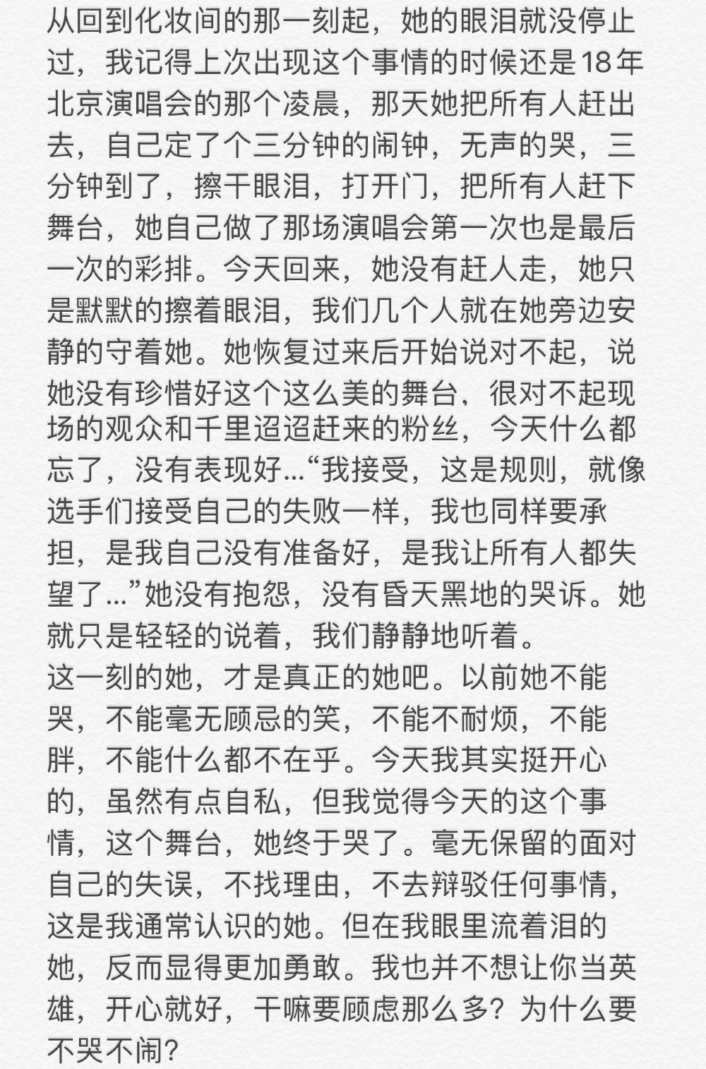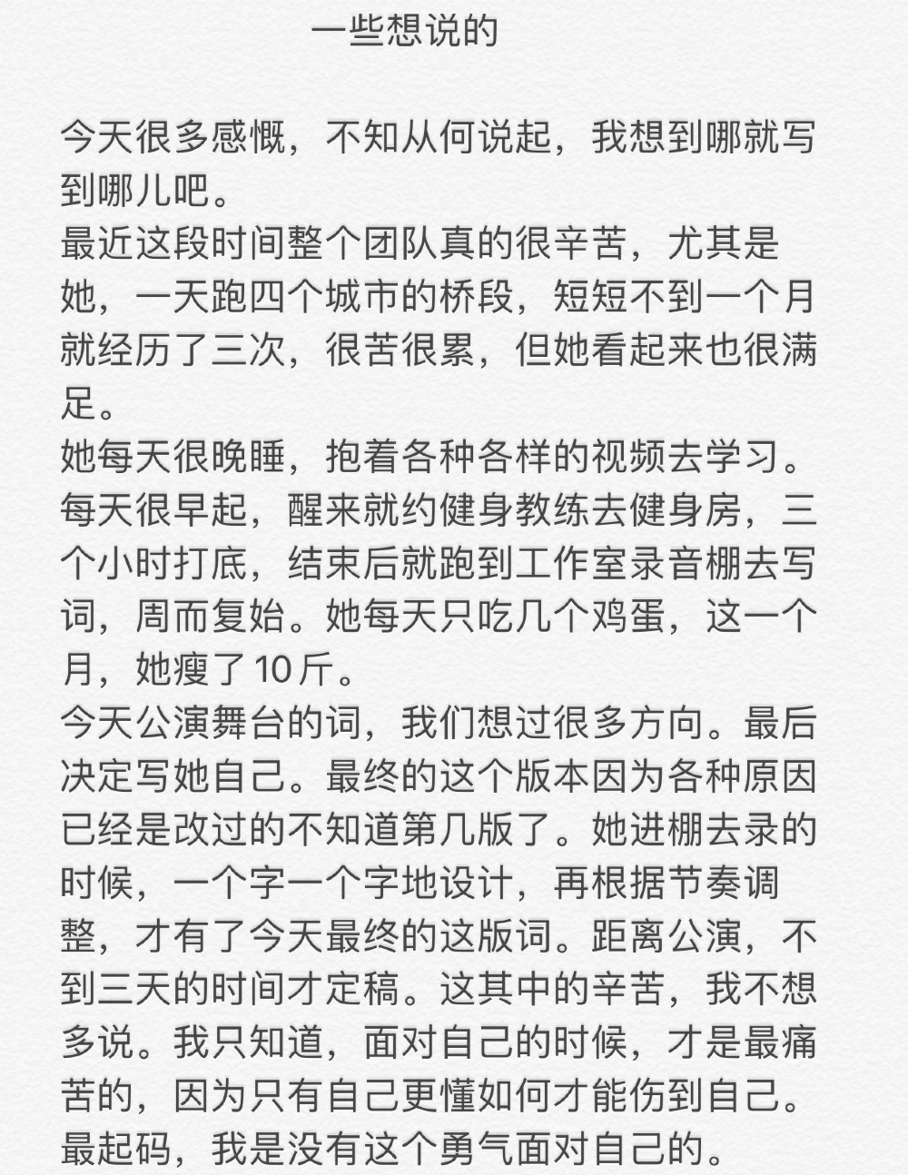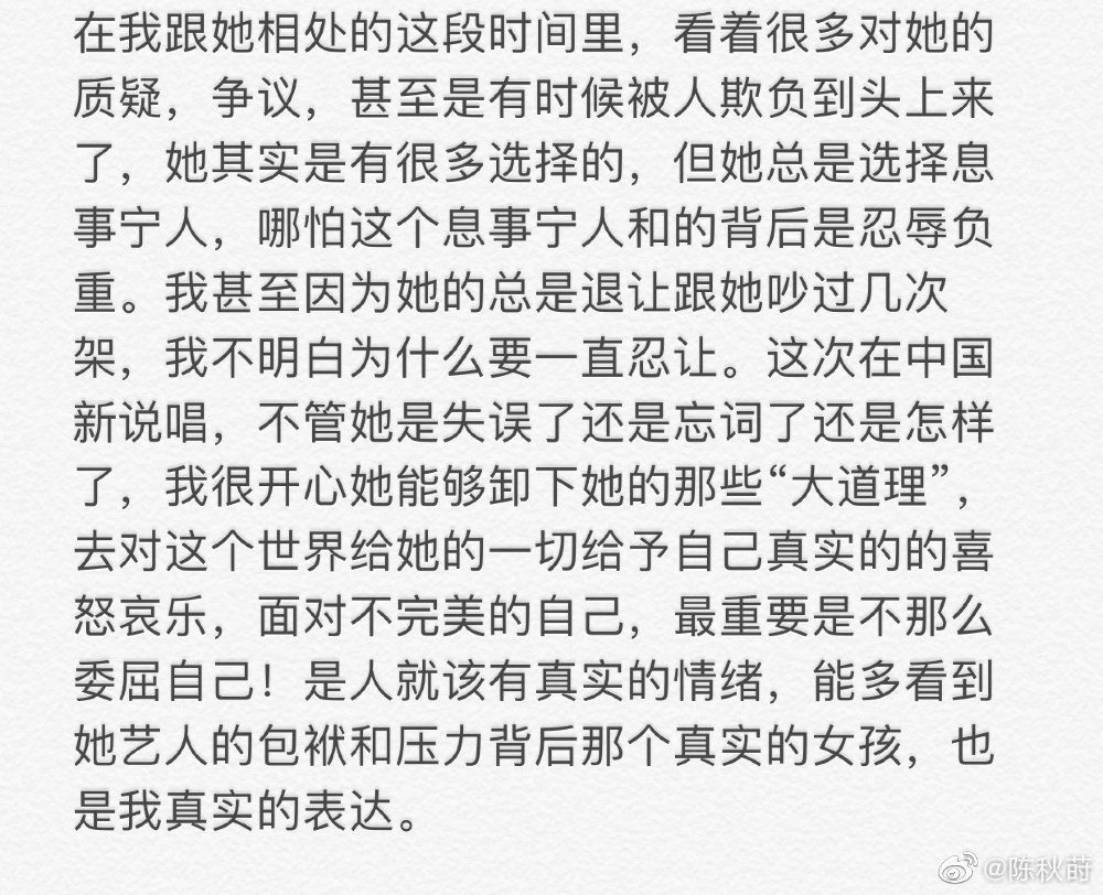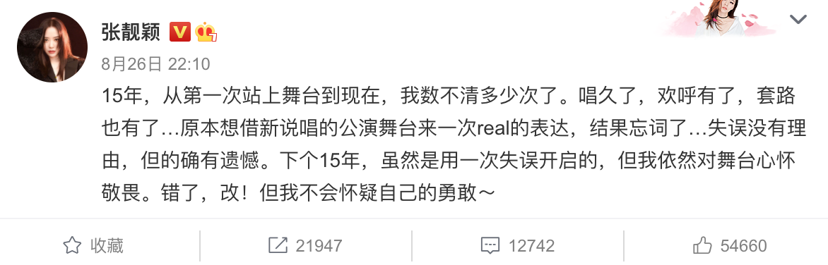 張靚穎26日晚上再度發文表示:「原本想借新說唱的公演舞台來一次real的表達,結果忘詞了…失誤沒有理由,但的確有遺憾。」原本她想透過這次的公演舞台讓網友刮目相看,沒想到卻發生忘詞意外,讓她十分自責。張靚穎的緋聞男友陳秋蒔也寫下「一些想說的,能說的,不能不說的。」力挺,文中詳細紀錄了張靚穎為了這次的表演所做的努力,以及這段時間承受的壓力等等,最後更感性告白:「以前她不能哭,今天我其實挺開心的,雖然有點自私,但這個舞台她終於哭了,在我眼裡流著淚的她反而顯得更加勇敢。」