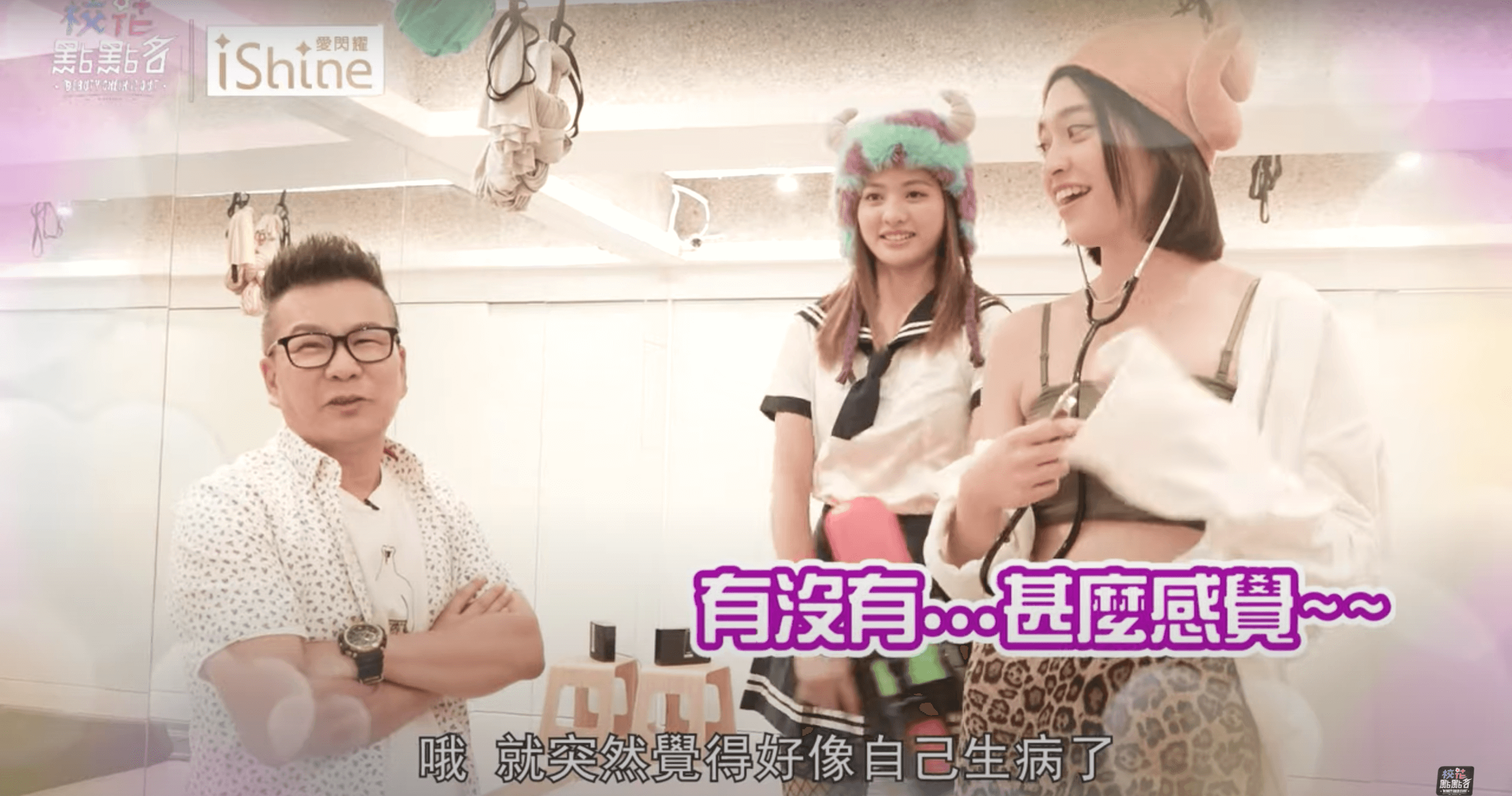 小露香肩的徐萱如問沈玉琳「你看我這樣有沒有什麼感覺」,沈玉琳回答「突然覺得自己好像生病了」,讓徐萱如拿著聽診器走近幫他聽診,美胸在前讓沈玉琳害羞偏過頭不敢看,更忍不住直呼「真的是要逼死老伯伯!這個一看血壓會升高。」過後兩人進行性感姿勢5連拍,徐萱如坐在地上秀出大長腿,姿勢十分妖嬈,而古筱瑄則拿著水槍擺出俏皮可愛的姿勢,最後卻突然吐舌撩起短裙,讓沈玉琳猝不及防表示「你竟然做出這種事情!」成為名副其實的「老伯殺手」。