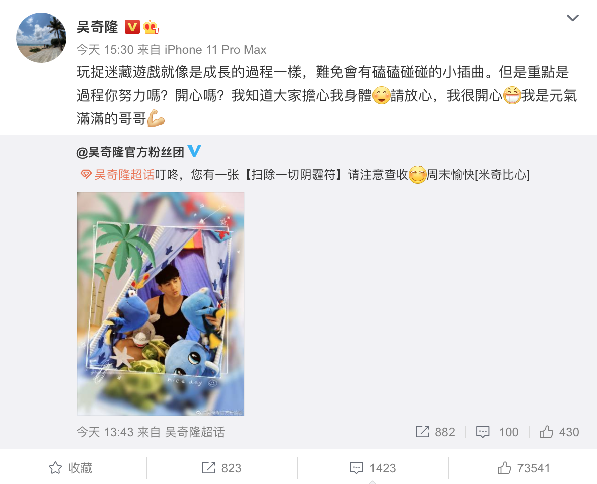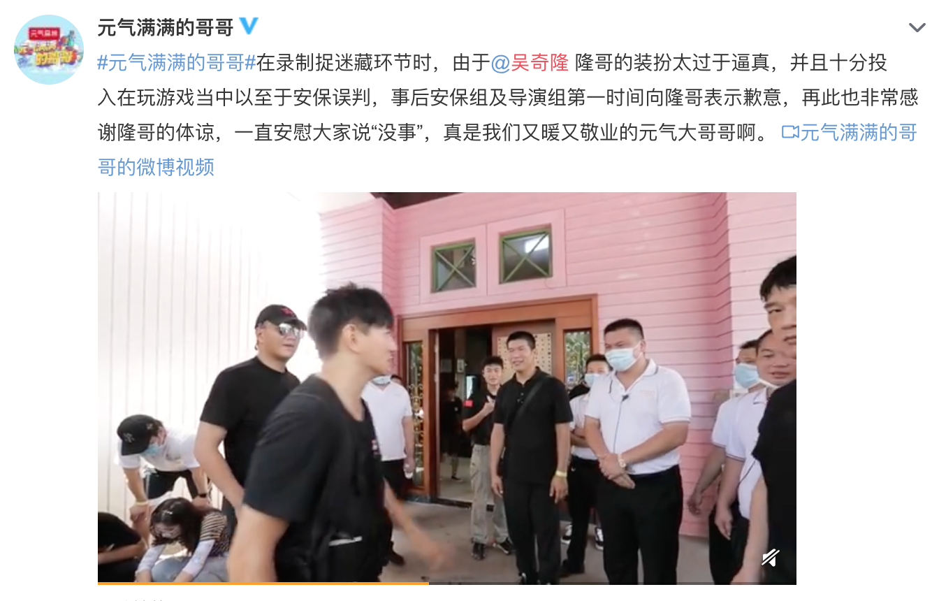 大陸綜藝節目《元氣滿滿的哥哥》在7月開播以來話題十足,製作組找來胡軍、吳奇隆、楊洋、陳學冬、王鶴棣等人氣男星組成「元氣大哥」及「元氣小哥」2隊互相競爭,豪華的卡司吸引了許多觀眾收看。在最新播出的內容中,藝人們來到遊樂園玩躲貓貓,吳奇隆在扮裝成工作人員後朝弟弟隊的楊洋突襲,卻遭到保安人員壓制在地,直到導演大喊「是藝人!」後才被認出,引發網友熱議。