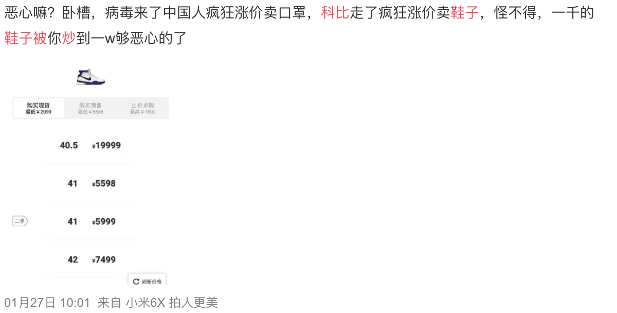 當時一雙NIKE MAMBA FOCUS Kobe湖人色系列的球鞋,在該APP上竟從人民幣599(台幣約2700),被瞬間炒到人民幣4899(台幣約22000),更有其他被轟抬到9萬台幣一雙,鞋販消費死者的行為更引發了國外粉絲的撻伐。
