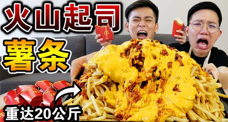 馬來西亞YouTuber「TwoDudes狠搞鬼」是由「Tick」和「Atticus」組成,影片主題是以美食為主。日前狠搞鬼在頻道上傳一則美食挑戰影片,Tick和Atticus要挑戰吃完重達20公斤的火山起司薯條,影片一出立刻掀起網友熱議,許多網友留言表示:「卡路里爆表!」