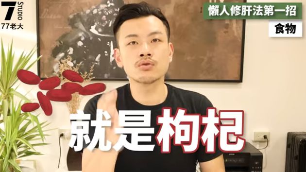 中醫系出身的YouTuber「77老大」擅長以中醫的角度告訴大家養生、減重的資訊。現代人的作息不正常,時常熬夜導致肝臟不好,日前77老大就針對「如何護肝」發布一則影片,首先,他表示因為肝是沈默的器官,除非到產生嚴重的問題否則不會出現警訊,因此要護肝必須從日常生活做起。接著他揭露了「懶人修肝法」,首先在飲食方面要多吃綠豆、薏仁、蘆筍、蘆筍、絲瓜、枸杞等等食物,其中77更推薦「枸杞」,他表示枸杞可以提高肝臟排毒解毒的功能。