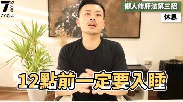 另外他也認為適度的休息對肝臟的保養有所助益,他表示在晚間的11點到隔日的凌晨3點是護肝的最好時間,由於這個時段人體的血液流經肝、膽,若在此時休息的話,肝臟的修復功能就會提升,77對此更直言:「12點前一定要入睡。」此外他也介紹了「穴道」、「茶飲」的護肝方法,若能做到以上4個方法,再加上早點睡、多喝水、少油炸、走出戶外及調整情緒的話,都有助於修護肝臟。