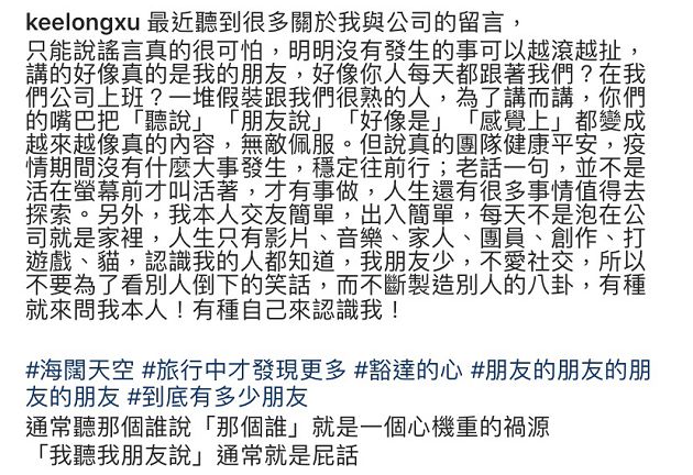 隨後展榮也對「道聽途說」的內容感到憤怒,他表示有很多人在外打著「跟他們很熟」的名號在外招搖,時常把「朋友說」、「好像是」、「感覺上」掛在嘴上並捏造事實。他接著向粉絲表示團隊目前很穩定:「團隊健康平安,疫情期間沒有什麼大事發生,穩定往前行」,並且呼籲大家:「不要為了看別人倒下的笑話,而不斷製造別人的八卦,有種就來問我本人」,而在文章的最後展榮也對造謠生事的人直言:「通常聽那個誰說,『那個誰』就是一個心機重的禍源。」