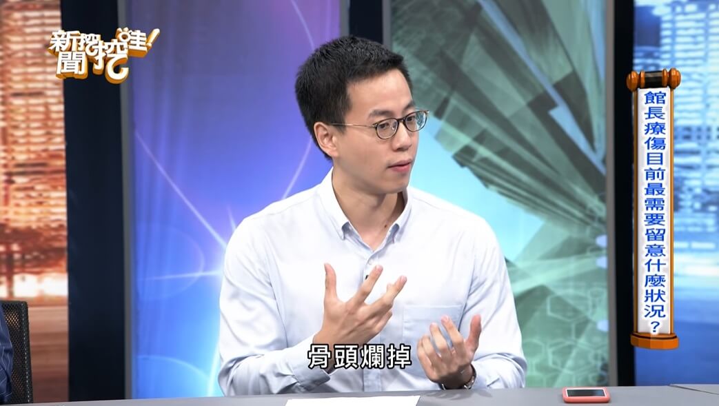 在最近播出的《新聞挖挖哇》節目中,復健科醫生王思恒談到館長中槍的事情,認為館長真正的關卡還沒到來,因為子彈有細菌,在射進身體內還會轉彎,讓肌肉大範圍的受損,甚至造成骨頭感染,讓館長得依靠抗生素來對抗病毒,如果到時候真的感染了,骨頭裡面也會爛掉,就必須挖其他部位的骨頭來填補了!