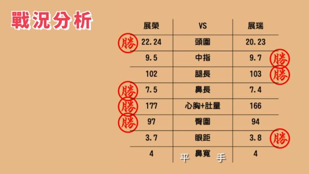 除此之外,展榮、展瑞還測量了腿長、臀圍、眼距等部位。結果出爐,展榮以4比3的比數險勝展瑞。不過,測量員表示雙方的長度大小的差距都非常微小,因此整體來說雙胞胎算是非常相像。影片最後,展瑞還開玩笑地提出下次要測量「體內指數」,比賽看雙胞胎的身體誰比較糟。