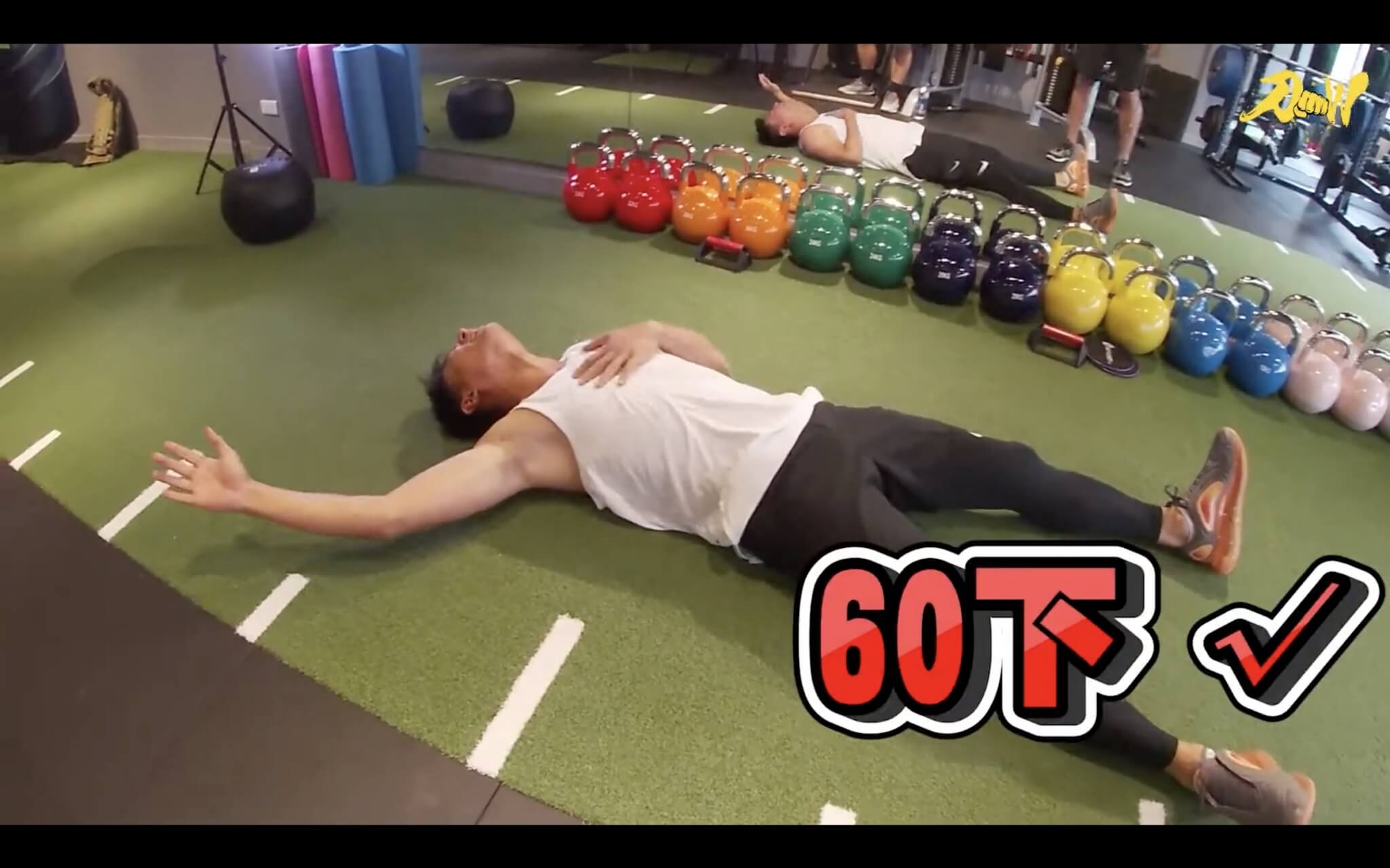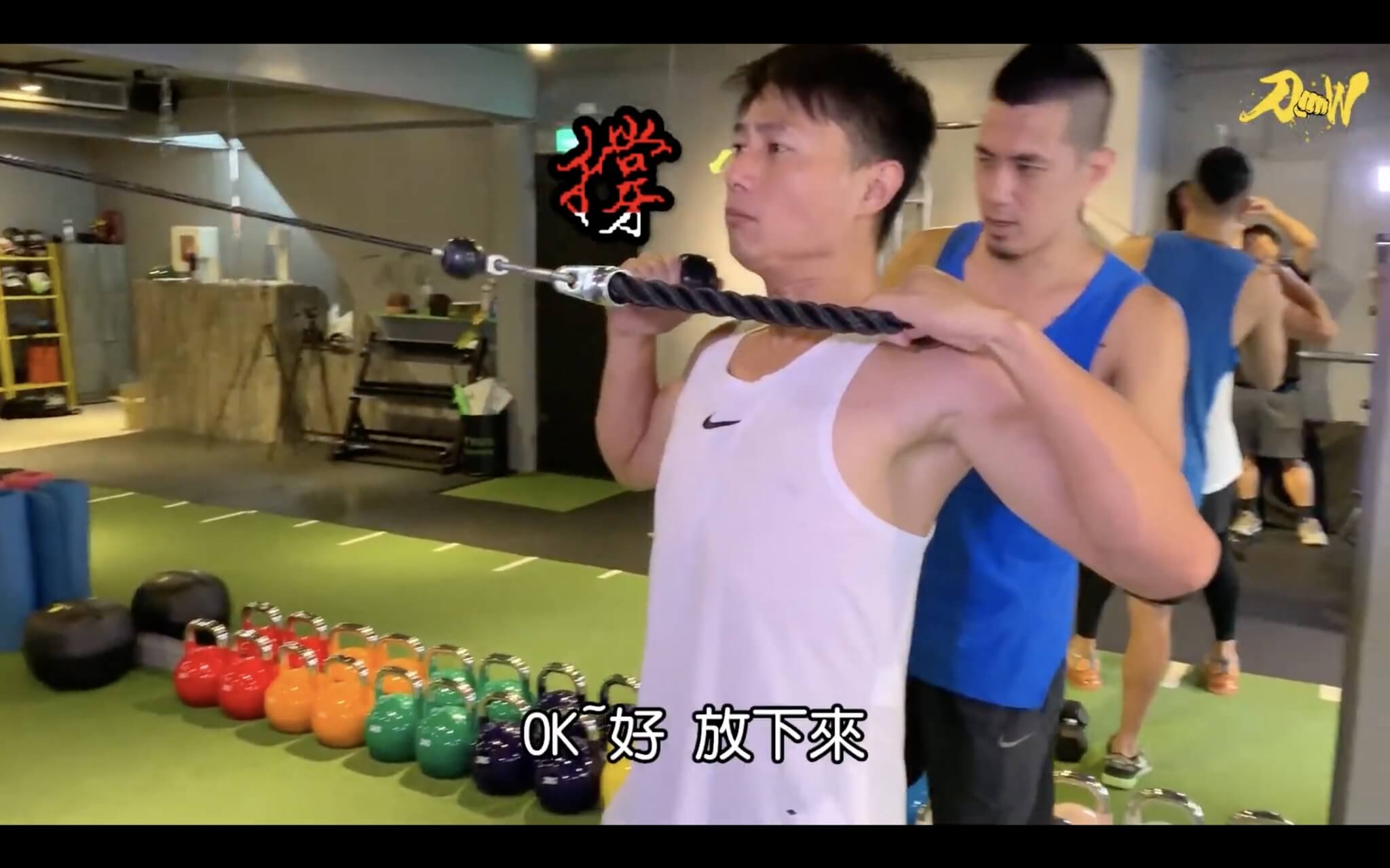 影片中可以看出,小刀前一天的訓練已經造成肌肉痠痛,不過還是咬著牙按照教練的指示進行訓練,光一開始的滾輪按摩就痛得小刀放聲哀號。訓練開始,教練以伏地挺身和滑盤登山者讓小刀熱身,這組動作非常考驗訓練者的核心肌群,影片中可以看到小刀做起來動作相當標準,可見平常就有維持不錯的運動基礎,才有辦法負荷這樣的訓練強度。