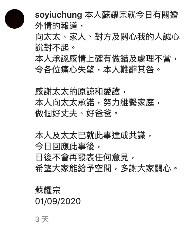 目前蘇耀宗已在FB發文道歉:「向太太、家人、對方及關心我的人誠心說對不起。本人承認感情上確有做錯及處理不當,令各位痛心失望,本人難辭其咎。」並表示太太已經原諒他,承諾以後會做個好丈夫、好爸爸,努力維繫家庭。