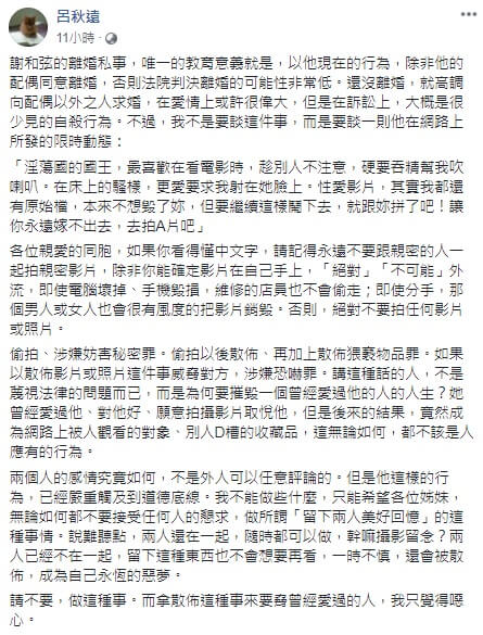 此外,律師對於謝和弦在網路上發的限時動態內容,也表示自己的看法,「各位親愛的同胞,如果你看得懂中文字,請記得永遠不要跟親密的人一起拍親密影片,除非你能確定影片在自己手上,「絕對」「不可能」外流,即使電腦壞掉、手機毀損,維修的店員也不會偷走;即使分手,那個男人或女人也會很有風度的把影片銷毀。否則,絕對不要拍任何影片或照片」。希望大家都可以引以為戒,不要讓自己成為受害者。