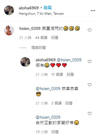 不少網友看了都紛紛留言表示,「太配了吧!」、「哎唷~很閃喔!」、「你好像喜憨!放了那女孩喔~」、「小嫻姐比較可愛!」、「很有夫妻臉耶!」、「這才是幸福啊~」、「祝福你們~要幸福哦!」。而小嫻自己看了金剛的貼文之後,也在底下留言表示,「其實滿閃的!」讓金剛看了也笑回「哪有~」,兩人自然的互動,讓不少粉絲看了都覺得很幸福。