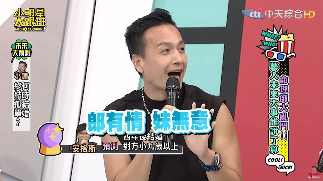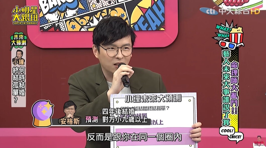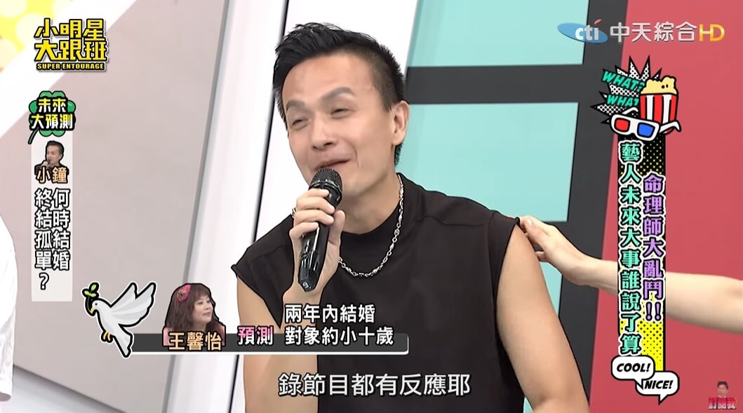 最近在《小明星大跟班》節目中,命理師艾菲爾就預測小鐘婚期遙遙無期,「他只是表現出熱情跟桃花緣,但他內心其實很孤單、孤獨,而且他只喜歡自己一個人相處!」更精闢的分析出,小鐘嘴巴上說想戀愛結婚,但是牌象來看,他沒有實際行動,可能在愛情中的感受跟獲得,只需要「5秒」,他就覺得自己已經擁有一切了,後來的其他東西他也都不需要了!