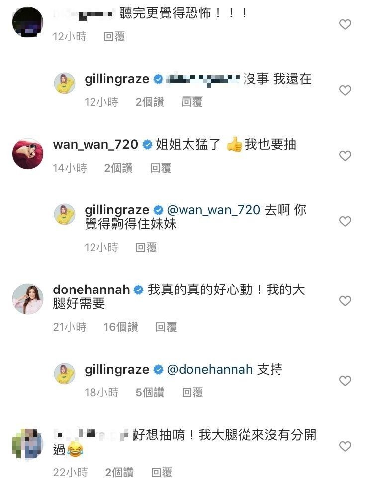至於要怎麼熬過過渡期,木星則表示抽脂本來就是一種很「快速暴力」的瘦身方式,因此術後要一直穿著塑身衣,剛開始身體也會有腫脹感,必須忍耐一段時間讓身體被塑型,她也強調一定要持續按摩,避免皮膚產生橘皮現象。網友看完影片後紛紛留言:「聽完更覺得恐怖!」、「好想抽唷!我大腿從來沒有分開過」董仔則回應:「我真的真的好心動!我的大腿好需要。」