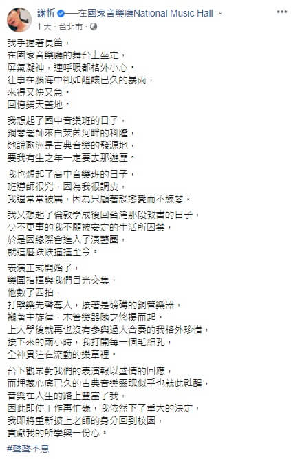 謝忻宣布「重返教職」!國家音樂廳演奏長笛:是音樂豐富了我