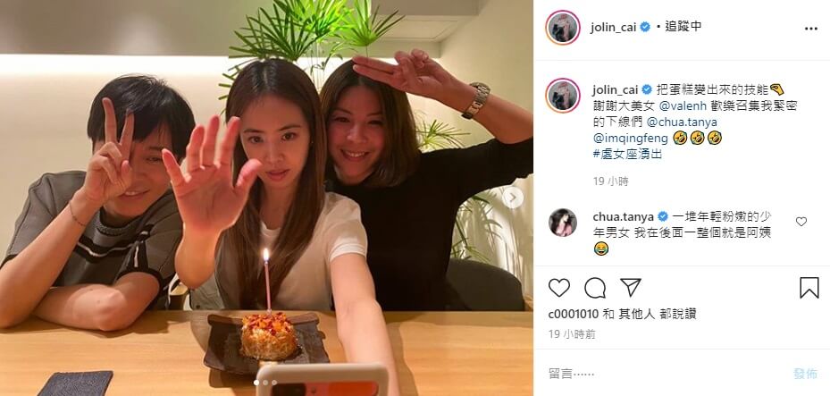 蔡依林將在15日度過她40歲生日,在14日深夜就貼出了自己跟青峰還有許茹芸的合照,並在貼文中寫道,「把蛋糕變出來的技能!謝謝大美女@valenh(許茹芸)歡樂召集我緊密的下線們@chua.tanya(蔡健雅)@imqingfeng(吳青峰)」,也不忘加上Hashtag「#處女座湧出」。