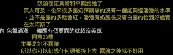 雖然Pan Piano曾被批評「只靠露乳」,但不少網友都認為Pan Piano很懂觀眾「想看什麼」,畫面又漂亮,不管是視覺還是聽覺都是雙重享受,也有網友認為她並沒有因為訂閱數高就亂接業配,爆紅後也沒有走歪,更有網友精闢分析:「無人可及,後來很多露奶彈鋼琴的沒有一個能夠達潘潘的水準,並不是露的多就會紅,潘潘有奶腿長皮膚白露的恰到好處實在太阿斯了。」也有網友指出Pan Piano從創立頻道以來一直保持「不露臉」的神秘風格才是最大關鍵,因為讓觀眾存在幻想,「可以幻想任何頭部接上去」,如果露臉後反而會幻想破滅,獲得不少網友認同。