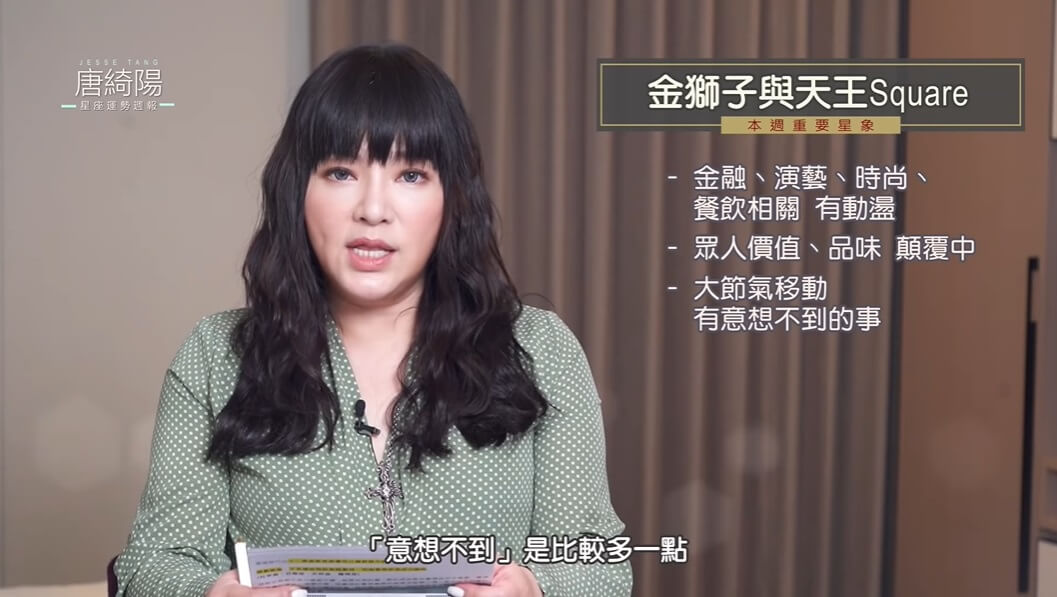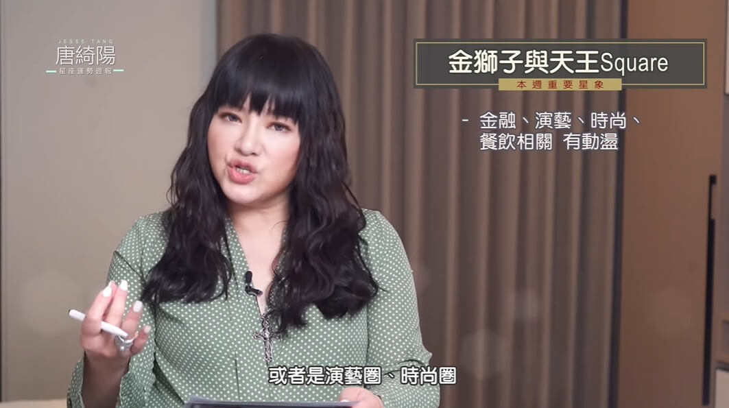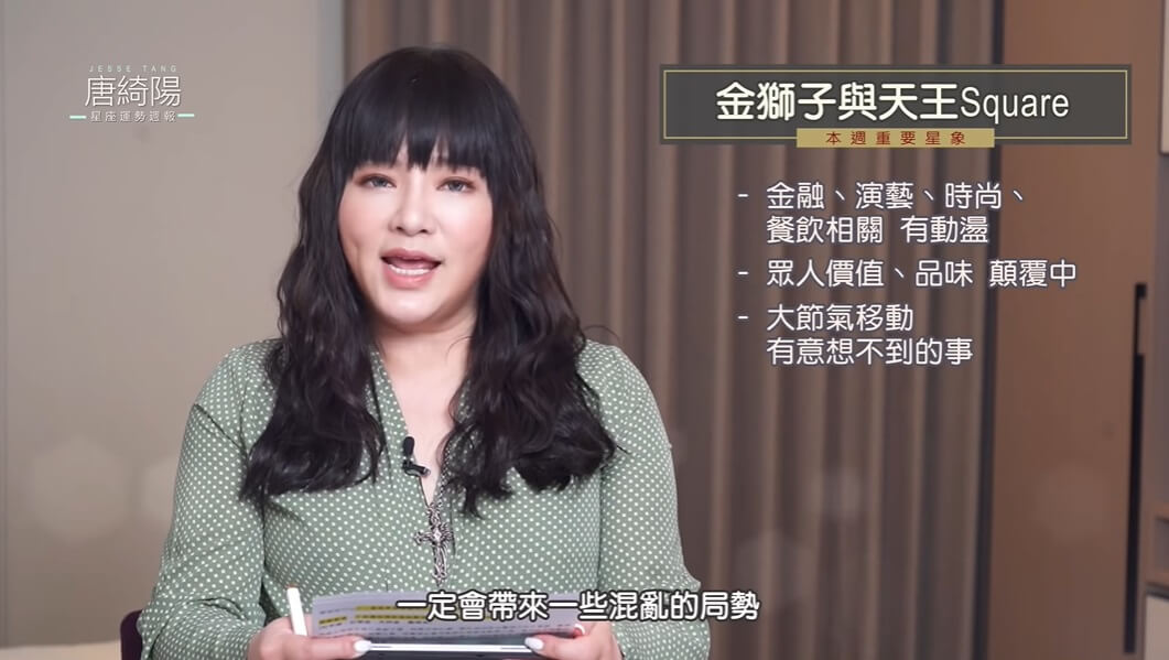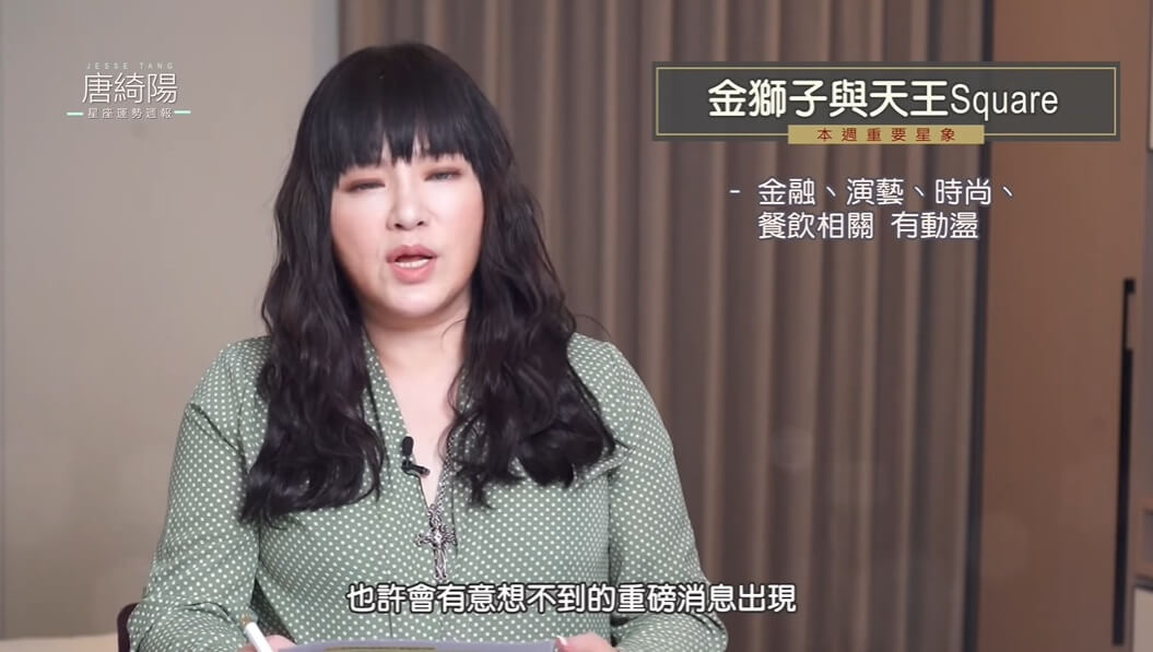 星座專家唐綺陽13日在Youtube頻道上發布了新片,跟粉絲們分享「9/14-9/20星座運勢週報」,其中在聊到金星在獅子座,它跟天王星形成一個相位「四分相」時,國師表示,「這會在金融業、時尚圈、演藝圈或是餐飲有關的部分,產生一個動盪」,可能會讓大家聽到很特別的消息,也許會有意想不到的重磅消息出現!