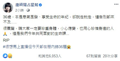 此外,唐綺陽也在影片中提醒大家,因為「秋分是一個大節氣,大節氣的移動,一定會帶來一些混亂的局勢,所以本週可能就會像剛剛講的『意想不到』會比較多一點,大家要有心理準備!」沒想到16日就爆出了黃鴻升離世的消息,震驚了各界。