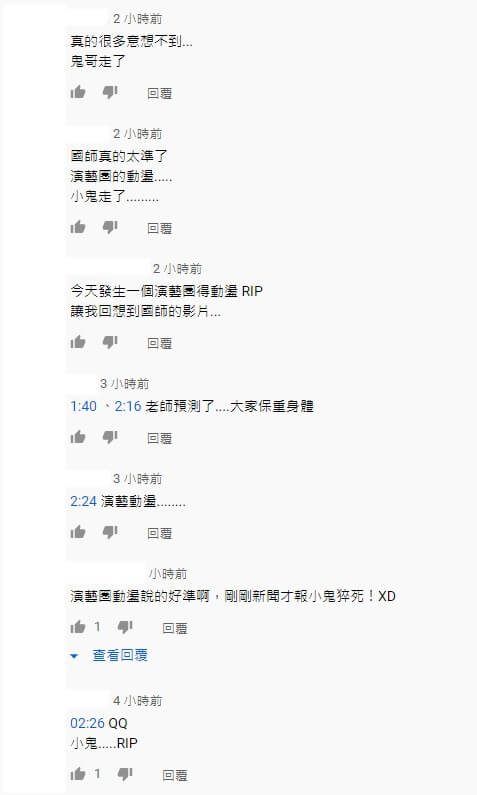 不少網友們也在得知小鬼離世之後,再回到唐綺陽的頻道又看一次影片,紛紛驚訝的留言表示,「真的很多意想不到...鬼哥走了」、「國師真的太準了」、「演藝圈的動盪...小鬼走了」、「今天發生一個演藝圈得動盪RIP讓我回想到國師的影片」、「老師預測...大家保重身體」、「演藝圈動盪說的好準啊!新聞報小鬼死了」、「演藝動盪...」。