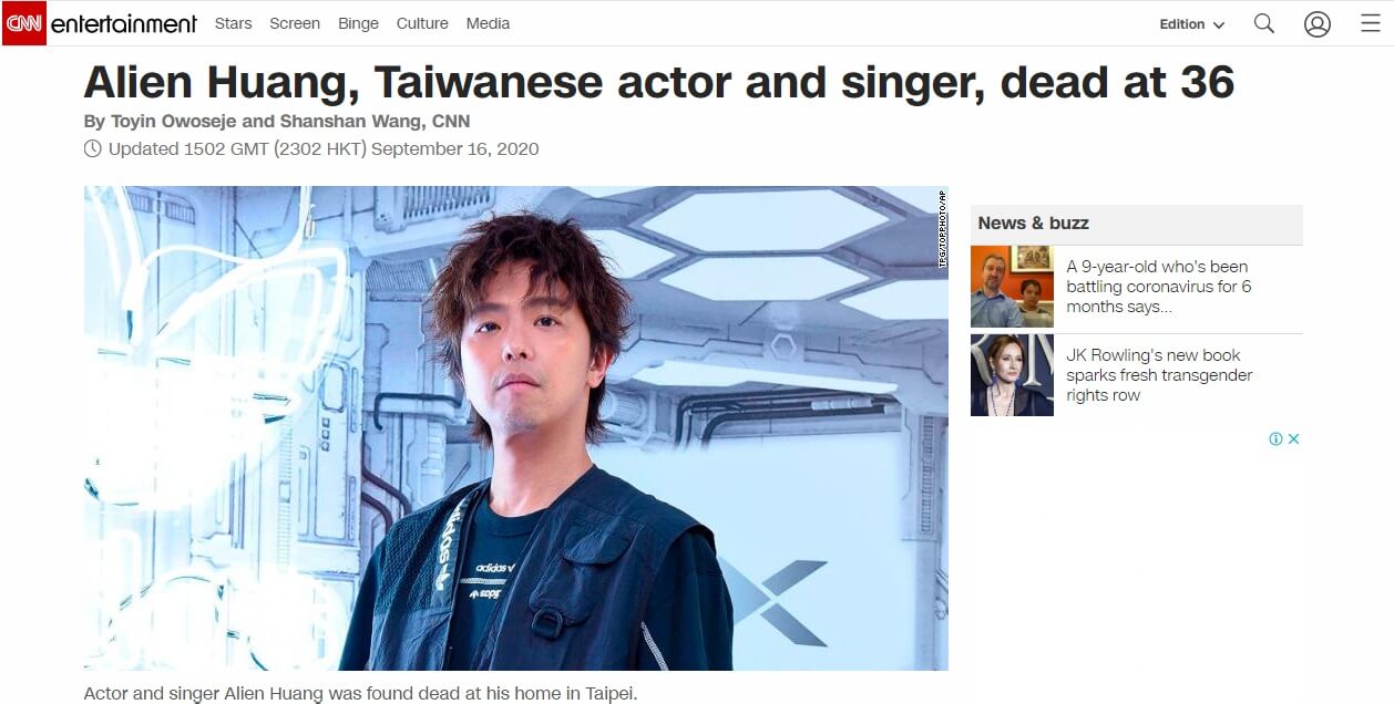 《CNN》在文章中引用了台灣《中央社》的報導,他們提到歌手兼演員的黃鴻升16日在北投的家中猝死,以及陳述被發現的過程,「警察到現場時,在浴室門口發現了《娛樂百分百》前主持人的遺體,浴缸的水依然還在流...」。