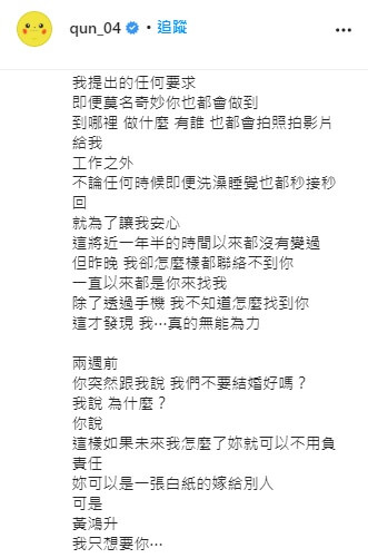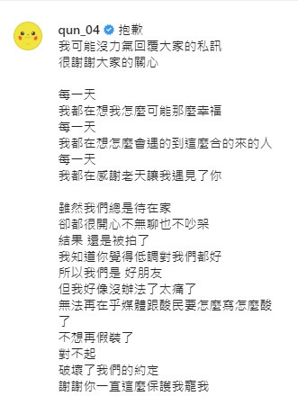 只是這場意外來的太突然,峮峮也知道低調對兩人都好,「所以我們是『好朋友』,但我好像沒辦法了太痛了,不想再假裝了,對不起!破壞了我們的約定」,她也透露,過去不管什麼時候,小鬼都會秒回,讓她可以安心,「但昨晚,我卻怎麼樣都聯絡不到你,一直以來都是你來找我,除了透過手機,我不知道怎麼找到你,這才發現我...真的無能為力」。