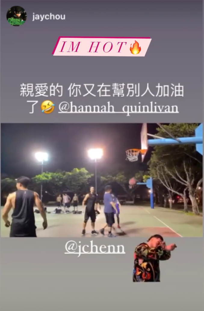 日前周杰倫在IG曬出與好友在公園打籃球的影片,愛妻也在場陪伴。身穿白色T恤、牛仔褲的昆凌綁著俏皮的丸子頭,與周董一對一訓練,昆凌負責主攻,拿起籃球越過老公投籃得分,展現天王夫婦私下自然又平凡的日常。過後周杰倫再po出自己與好友比賽的影片,只見昆凌在影片中竟然為好友歡呼打氣,讓他相當吃醋,在限時動態無奈表示:「親愛的,你又在幫別人加油了。」