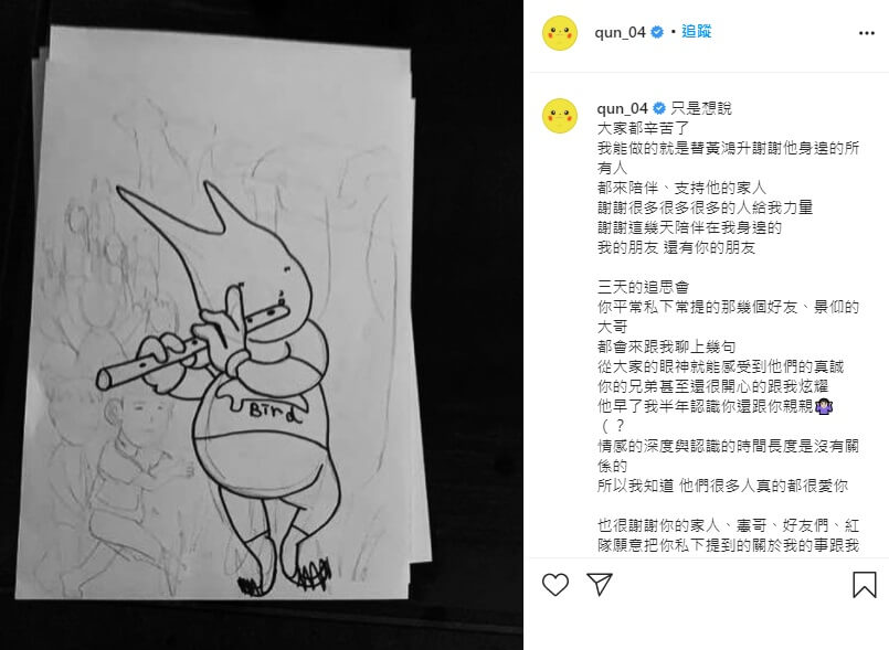 峮峮23日在社群平台上貼出塗鴉照,並在貼文內容中寫道,「三天的追思會,你平常私下常提的那幾個好友、景仰的大哥,都會來跟我聊上幾句,從大家的眼神就能感受到他們的真誠!情感的深度與認識的時間長度是沒有關係的,所以我知道,他們很多人真的都很愛你」。