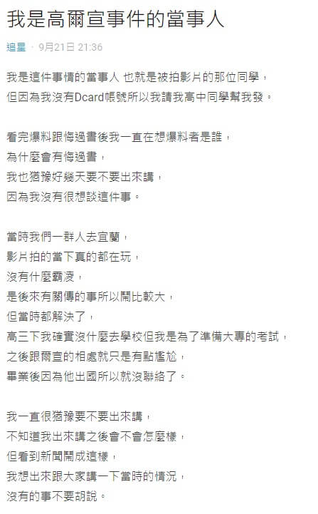 而這位朋友A後來也在Dcard上發文回應這整起事件,「看完爆料跟悔過書後我一直在想爆料者是誰,為什麼會有悔過書,我也猶豫好幾天要不要出來講,因為我沒有很想談這件事。」接著他也透露,「影片拍的當下真的都在玩,沒有什麼霸凌,是後來有關傳的事所以鬧比較大,但當時都解決了,高三下我確實沒什麼去學校但我是為了準備大專的考試,之後跟爾宣的相處就只是有點尷尬,畢業後因為他出國所以就沒聯絡了。」