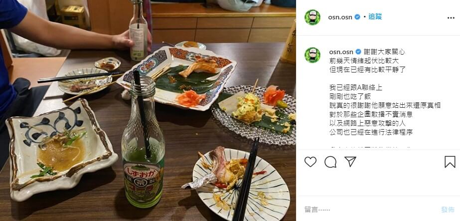 高爾宣在IG發文曬出一張在餐廳吃飯的照片,並在貼文內容中寫道,「前幾天情緒起伏比較大,但現在已經有比較平靜了!我已經跟A聯絡上,剛剛也吃了飯,說真的很謝謝他願意站出來還原真相!」他也在文中提到,「對於那些企圖散播不實消息,以及網路上惡意攻擊的人,公司也已經在進行法律程序!我會盡快找回狀態繼續工作,大家不用擔心!」