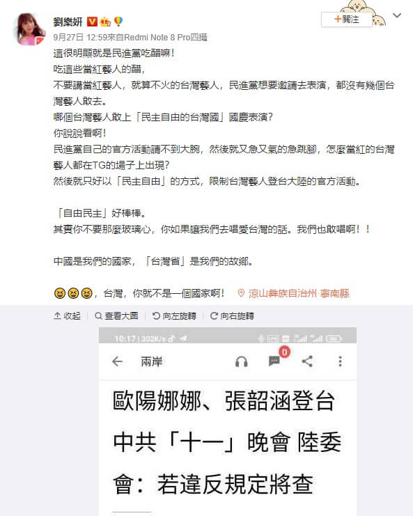 劉樂妍29日在微博上貼出了多張新聞報導的截圖畫面,並在貼文內容中寫下,「這很明顯就是民進黨吃醋嘛!吃這些當紅藝人的醋,不要講當紅藝人,就算不火的台灣藝人,民進黨想要邀請去表演,都沒有幾個台灣藝人敢去!」還認為是台灣請不到大咖的藝人,「民進黨自己的官方活動請不到大腕,然後就又急又氣的急跳腳,其實你不要那麼玻璃心,你如果讓我們去唱愛台灣的話~我們也敢唱啊!」