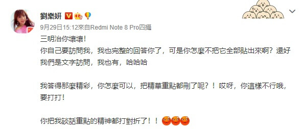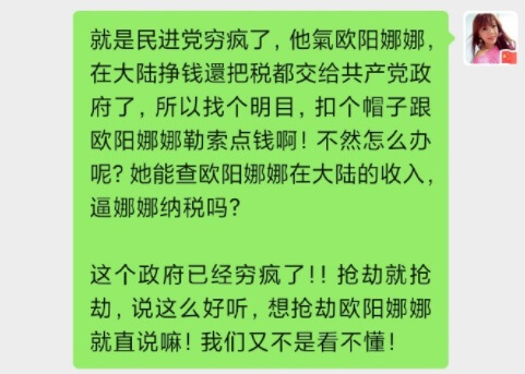 更引人注意的是,劉樂妍在內文中還提到,「中國是我們的國家,『台灣省』是我們的故鄉。台灣,你就不是一個國家啊!」並且提出自己對於歐陽娜娜風波的看法,「民進黨窮瘋了,氣歐陽娜娜在中國掙錢還把稅都交給共產黨,所以找個名目來跟歐陽娜娜勒索錢啊!」