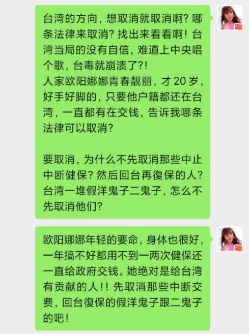此外,有許多網友都說要台灣政府取消歐陽娜娜的健保,劉樂妍則是認為,「要取消就取消啊!哪條法律來取消?」還接著解釋,歐陽娜娜都有繳健保費,政府沒有理由可以取消的她的健保資格,甚至直呼,「她對台灣是有貢獻的!何不先取消那些中止中斷健保,回台才又復保的人?」並嗆聲說,「台灣一堆假洋鬼子二鬼子,怎不先取消他們?」