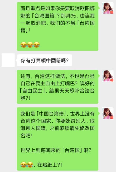 最後,劉樂妍也毫不客氣的說,「如果要取消歐陽娜娜的台灣國籍,那拜託,連我的也一起取消吧!我們不屑台灣國籍!」甚至指出,「台灣若這樣做,就是在民主自由上打嘴吧!世界上到底哪來的台灣國?在貼紙上?」