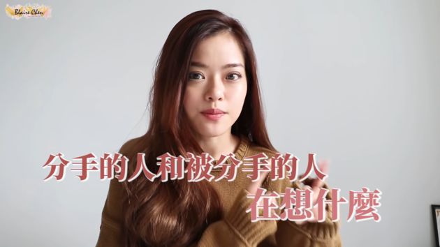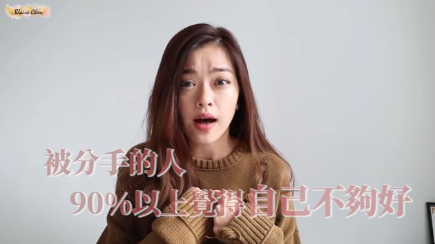YouTuber「BlaireChen左撇子」時常在頻道中分享自己對於愛情的看法,日前她上傳一則影片,藉由《有一種分手較不遺憾》一書,來解析「分手的人」及「被分手的人」兩者的心態進行分析,她表示被分手的人,有90%以上都覺得自己不夠好,會有相當多疑問覺得自己做得不好,才會導致分手。Blaire也覺得把分手歸咎於自己不好,是一個很錯誤的觀念,而被分手的人傾向去解決問題,提分手的人則認為問題無法解決。
