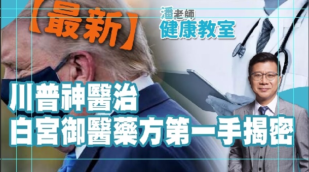 潘懷宗主持的《潘老師的健康教室-潘懷宗》,分析白宮御醫開給川普的6種藥組合藥方,他表示,川普公布的影像,神清氣爽,感覺良好,更讓大家好奇到底白宮總統醫生給川普那些治療藥物?他依據白宮新聞稿,分析川普藥物,包括抗體療法靜脈注射,針對新冠肺炎的雞尾酒療法,以及鋅、維生素D,增加免疫系統的抵抗力,抑制胃酸的藥、阿斯匹靈、褪黑激素,他表示,這些藥物的副作用非常低,效果卻顯著,可提高免疫力,「現在川普看起來非常好,但真正的挑戰在往後的一個星期,這樣的藥方,畢竟對一個75 歲年紀大的微胖老人,效果怎樣,需持續觀察。」