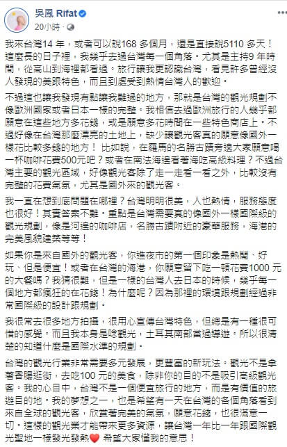 藝人吳鳳從土耳其來台灣發展也已經有14年的時間,他也順利在2018年拿到中華民國身分證,並且歸化成了「正港台灣人」,讓不少台灣人都替他感到開心!而曾經主持過旅遊節目9年時間的他,也算是走過台灣大大小小的旅遊景點,而他最近也在臉書上提出他發現了台灣旅遊的困境與問題,意外的引起了網友們的熱烈關注與討論!
