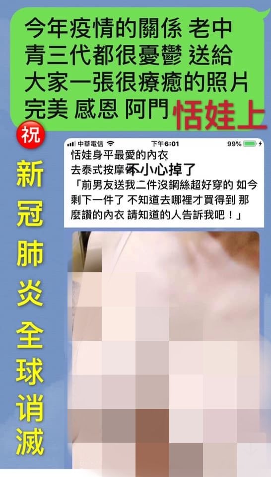 過後她再度上傳自己只穿內衣的實拍照,貼心做成「長輩圖」,圖片中寫著:「今年疫情的關係,老中青三代都很憂鬱,送給大家一張很療癒的照片,完美、感恩、阿門」,大方送上自己的雪乳照片,並祝新冠肺炎全球消滅。引來網友留言:「身材保持得真好」、「好大」、「哇⋯⋯偶像」、「建議下次可以在上面貼照片,對方就不敢拿了」、「超級偶像」。