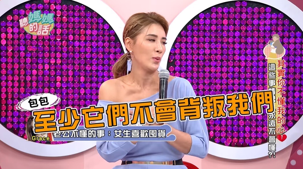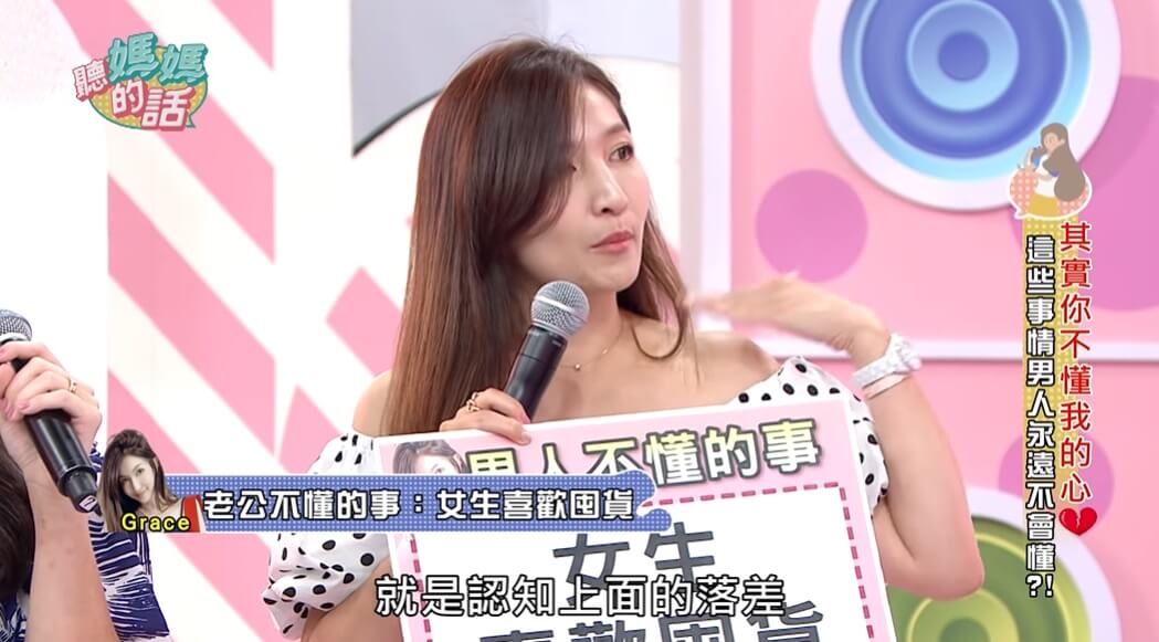 Grace最近在《聽媽媽的話》節目中分享了自己跟老公阿翔的生活日常,當聊到女生喜歡囤貨這一件事情時,Grace也坦言,「女生真的會喜歡囤貨,不管是日常用品或是衣服、飾品」,但她老公總是無法理解為什麼她會這麼做,讓她忍不住在節目中直呼,「這是在囤一個幸福感!」而夏宇童則馬上說,「你們男人又給不了幸福感,當然就只好囤包包啦!」