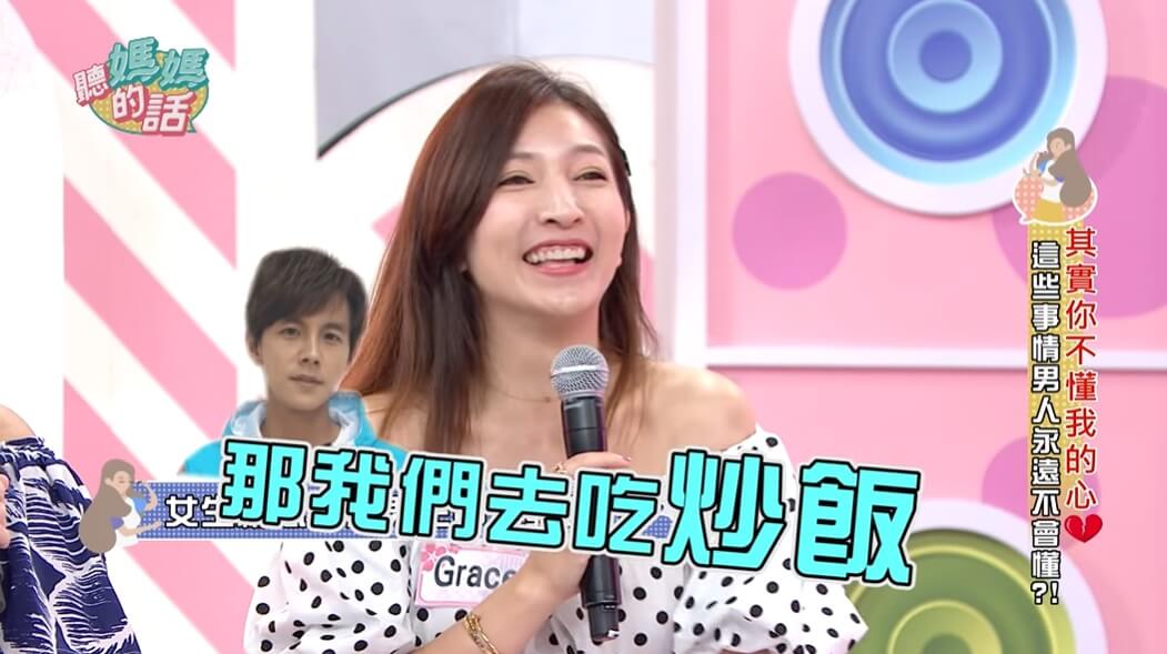 此外,Grace也忍不住抱怨阿翔很不愛打理外貌,像是之前兩人就有討論要去外面吃飯,於是Grace認真的打扮了一下自己,想說老公可以懂她的心思,帶她去吃好料的,所以當老公問她要吃什麼的時候,她就說「都可以呀~」不料,阿翔竟回她,「那我們吃炒飯!」讓Grace當場氣到不行,其他來賓也都覺得阿翔這樣很母湯!