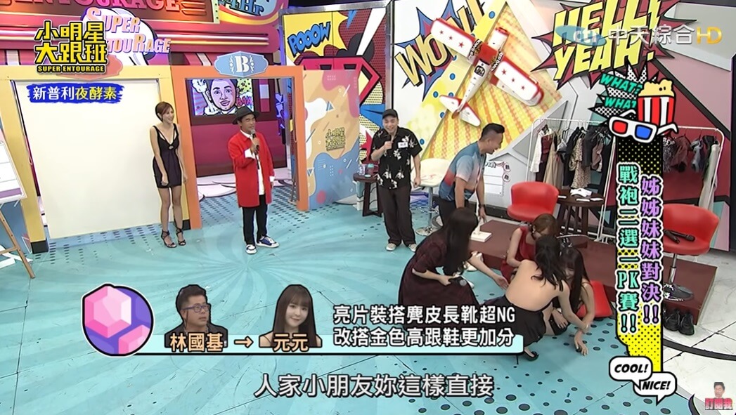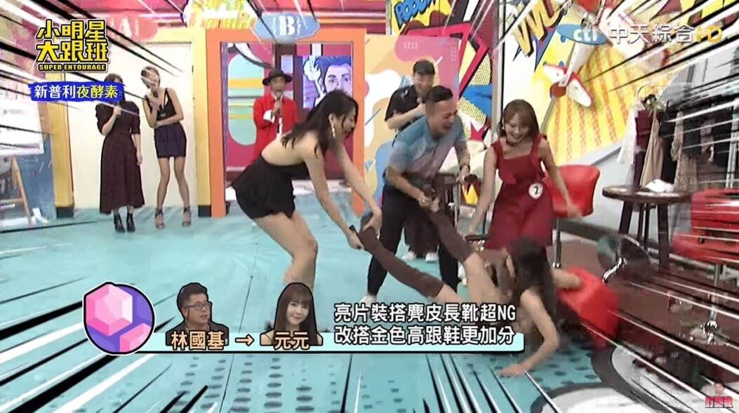 在場所有人看到元元重摔在地之後都大叫了出來,元元自己也是摔下來之後,一瞬間也沒注意到曝光了沒,等到回神之後才趕緊用手遮住,而主持人憲哥跟Sandy在一旁看了也傻眼,憲哥回神過來也馬上驚呼,「這老妹太可怕了你!攻擊性太強了,你故意的,人家小朋友你怎這樣!」
