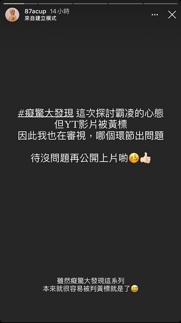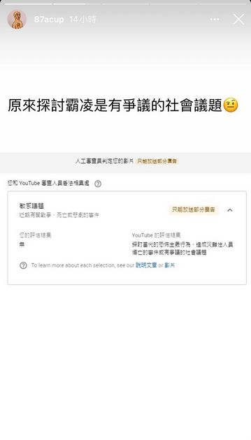 影片中,還探討其他許多關於霸凌的議題,讓許多人更理解相關行為背後的動機,以及處理方式。不料此片一出,卻立刻被YT判定黃標,進行人工審查後,判定影片觸及敏感議題,讓痴痴無奈「原來探討霸凌是有爭議的社會議題」,但痴痴認為這是個很棒的議題,需要更多人知道並且了解,才有機會改善,讓世界更好!