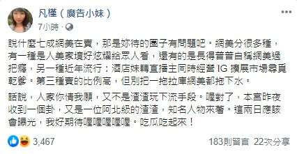 在橫綱凱咪爆料指出「7成網美都在賣」的傳聞之後,引起了網友們相當大的討論,廣告小妹得知這些事情之後,也在自己的臉書發文寫下,「說什麼七成網美在賣,那是妳待的圈子有問題吧!」並接著解釋,「網美分很多種,有一種是人美家境好炫耀給眾人看,還有的是長得普普自稱網美過把癮,另一種近年流行的:酒店妹轉直播主同時經營IG擴展市場尋覓乾爹」,還直接點出「第三種賣的比例高,但別把一拖拉庫網美都拖下水」。