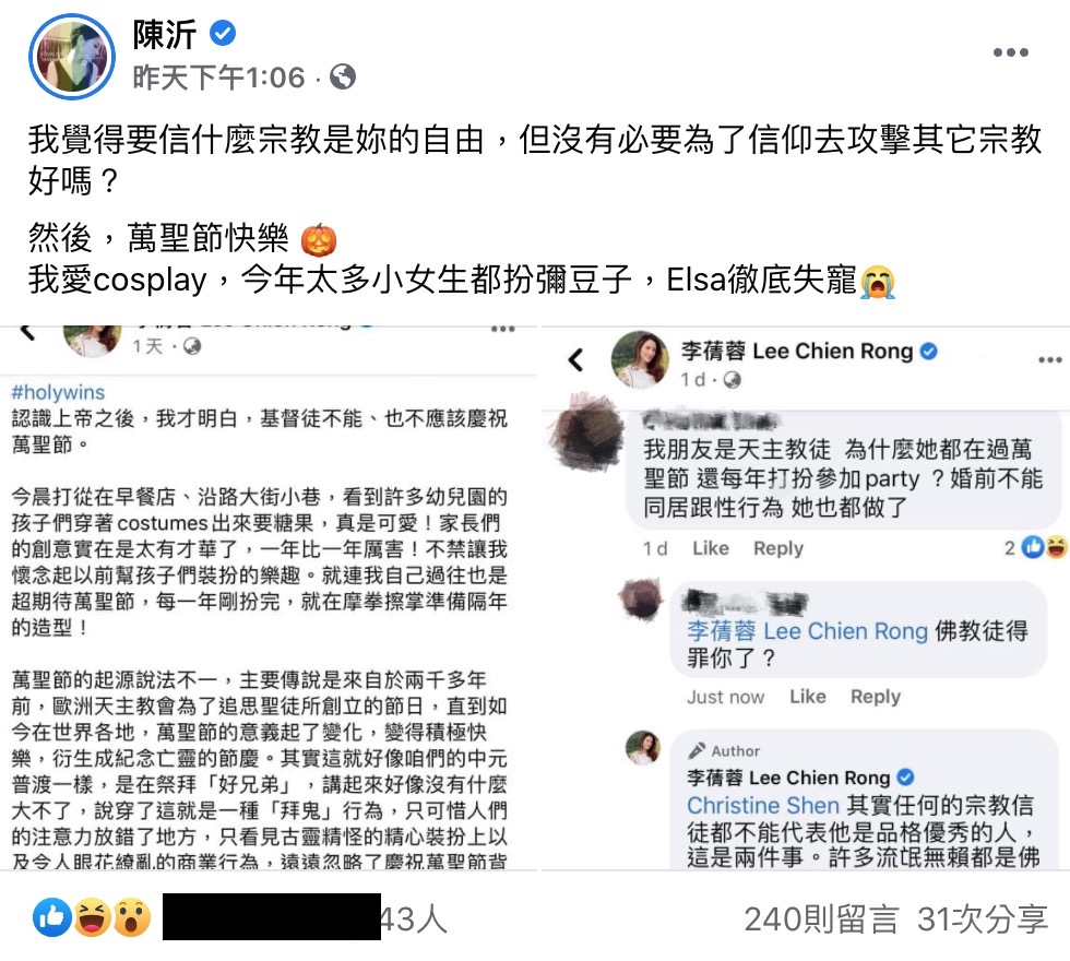 有網友留言:「我朋友是天主教徒,為什麼她都在過萬聖節,還每年打扮參加party?」李蒨蓉回覆:「其實任何的宗教信徒都不能代表他是品格優秀的人,這是兩件事。許多流氓無賴都是佛教徒,不是嗎?」此言一出就被罵爆,李蒨蓉的臉書也一度緊急關閉。網紅陳沂也在個人臉書諷刺:「我覺得要信什麼宗教是妳的自由,但沒有必要為了信仰去攻擊其它宗教好嗎?」
